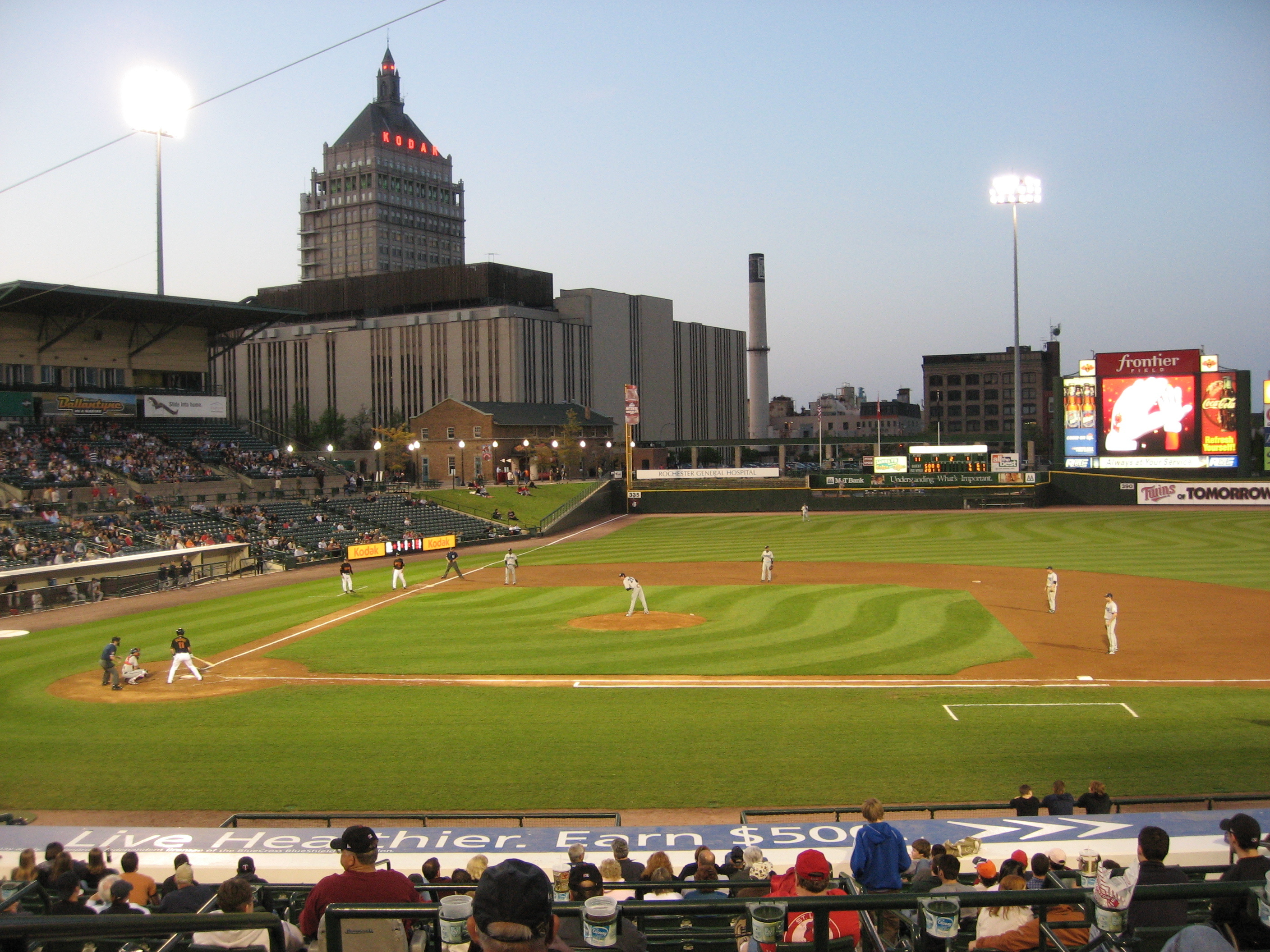在球場外我們還跟騎警照相,進了球場第一個感想是:這球場好小啊!感覺外野手每顆球都可以接得到啊!不過仔細看發現中外野全壘打牆上有402呎的標記,後來我們研判應該是米國球場觀眾席比較低造成的錯覺;因為在電視牆上看起來球場還滿大的。 球場沒有外野看台,外野出去就是Kodak(左外野)和Xerox(右外野)的大樓。我們買的票是一壘側上方看台,主場球隊休息室的上方。我們買了hotdog plate和飲料,找到位子才剛開始吃,球賽就開始了:全體肅立,小朋友合唱團唱了走音又掉拍的米國國歌,接著是一局上客隊進攻。客隊穿灰色球衣藍字,地主隊穿黑衣白褲紅字;我們幾個都很怕加錯油,等一下出球場會被蓋布袋。